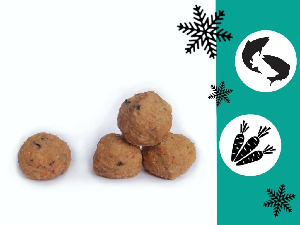Obsahuje: 40% losos svalovina, 35% kapr celý bez vnitřností, 20% sezónní zelenina, 5% ovesné vločky